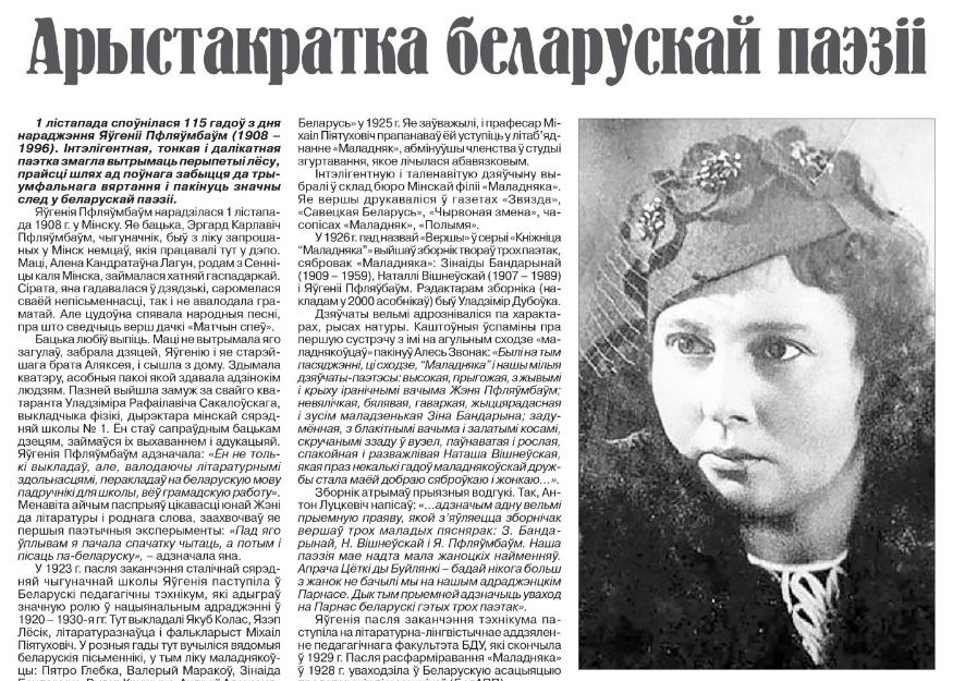 Яўгенія Пфляўбаўм - інтэлігентная, тонкая, далікатная паэтка. Яна прайшла праз цяжкія гады ліхалецця, здолела захаваць арыстакратызм і пакінула значны след у беларускай літаратуры.