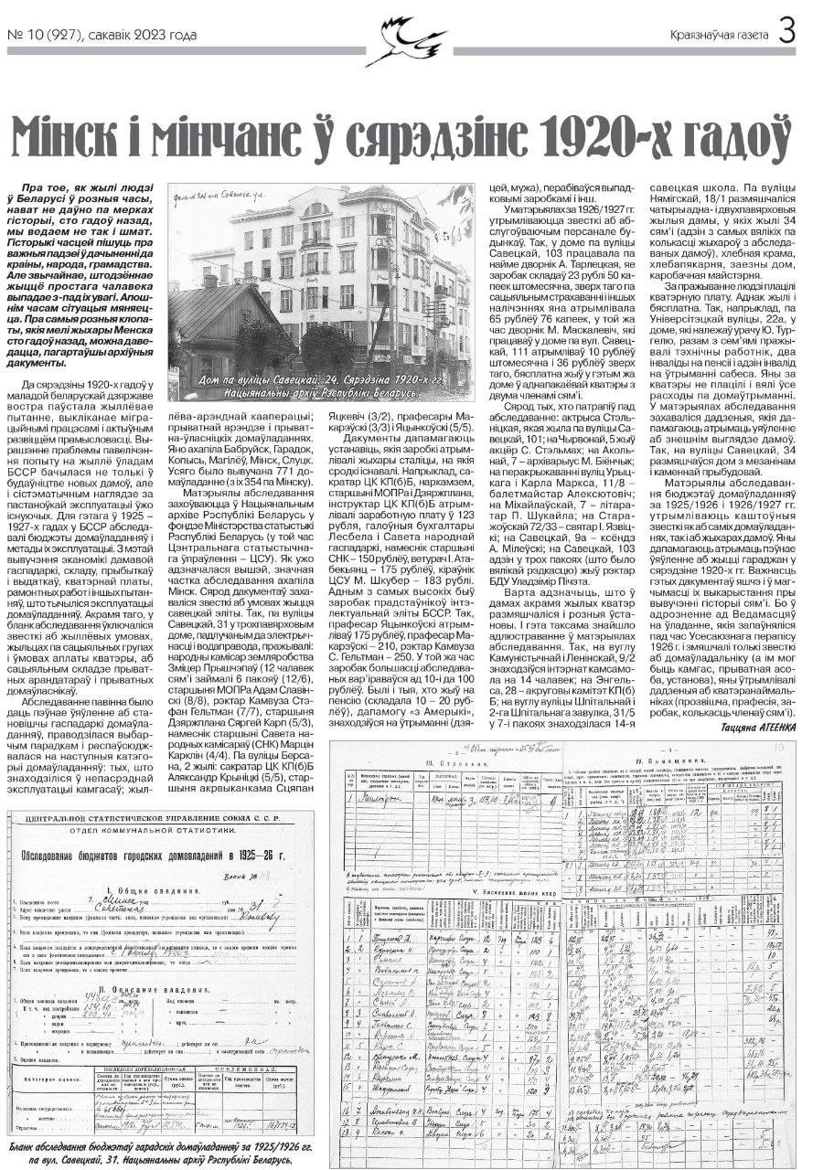 Між іншым, з аднаго "Абследавання бюджэтаў гарадскіх домаўладанняў 1925-1927 гг." можна даведацца шмат цікавага пра ўмовы жыцця людзей таго часу. У чарговую вандроўку па старонках Краязнаўчай газеты запрашае Максім Гальпяровіч разам з аўтарам артыкула Таццянай Агеевай.