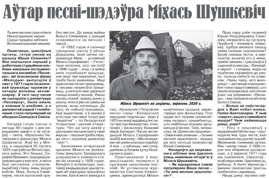 "Справечныя карані, родная мова, сям'я - гэта тое, без чаго нельга застацца чалавекам," - гаварыў паэт, аўтар хіта, які ёсць амаль ва ўсіх альбомах "Песняроў", збіральнік беларускага фальклору, Міхась Шушкевіч.
