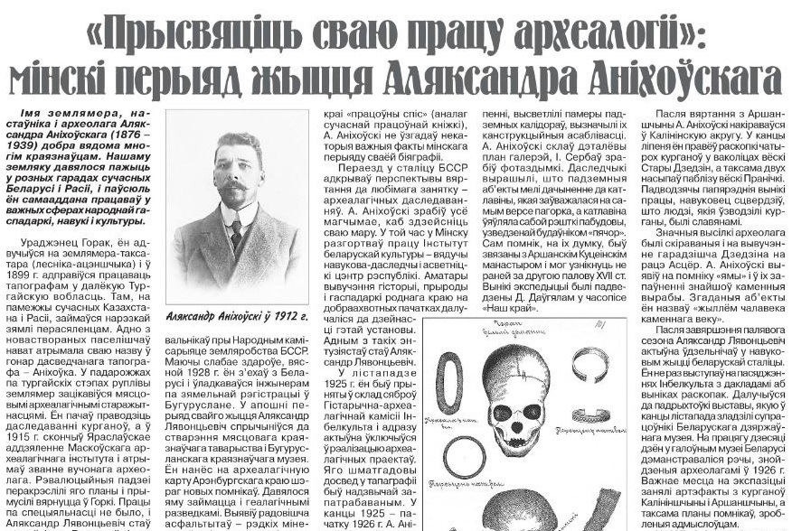 Чым адметная асоба Аляксандра Аніхоўскага? Гэта краязнаўца, археолаг, настаўнік, землямер, які пакінуў значны след у гісторыі археалагічных даследаванняў нашай краіны. Пра яго дзейнасць на Беларусі апавядаецца ў артыкуле Аляксандры Вайтовіч.