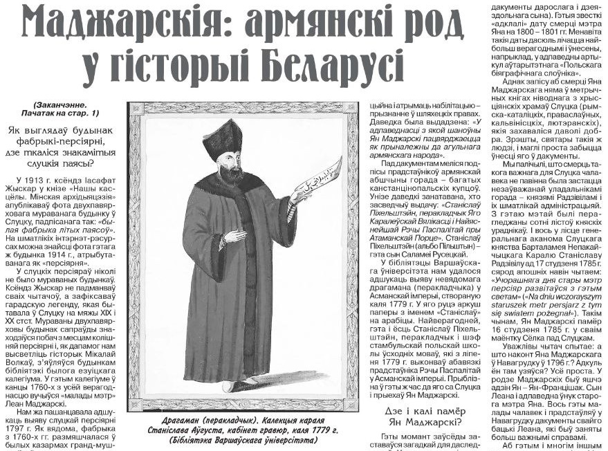 Ці ведаеце вы, што стваральнікамі знакамітых слуцкіх паясоў былі армяне з роду Маджарскіх? Кім яны былі? Як трапілі на Беларусь? Што пакінулі пасля сябе? Расказвае Максім Гальпяровіч паводле артыкула Дзяніса Лісейчыкава.