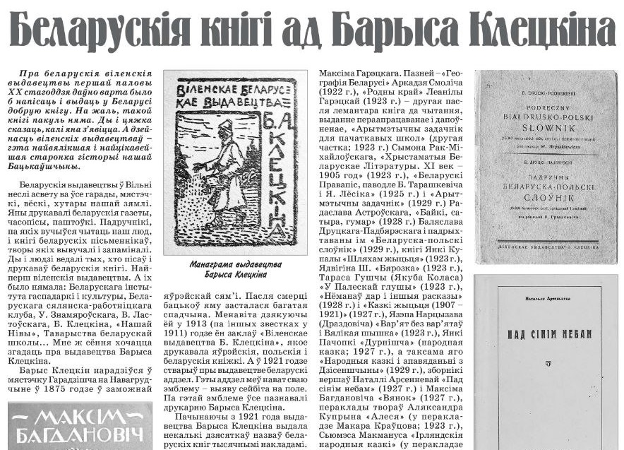 Барыс Клецкін - адзін з беларускіх выдаўцоў, што з першай палове XX ст. працавалі ў Вільні. Як ён стаў кнігадрукаром? Якія выданні выйшлі ў друкарні Барыса Клецкіна? Пра гэта і не толькі ў артыкуле Сяргея Чыгрына.