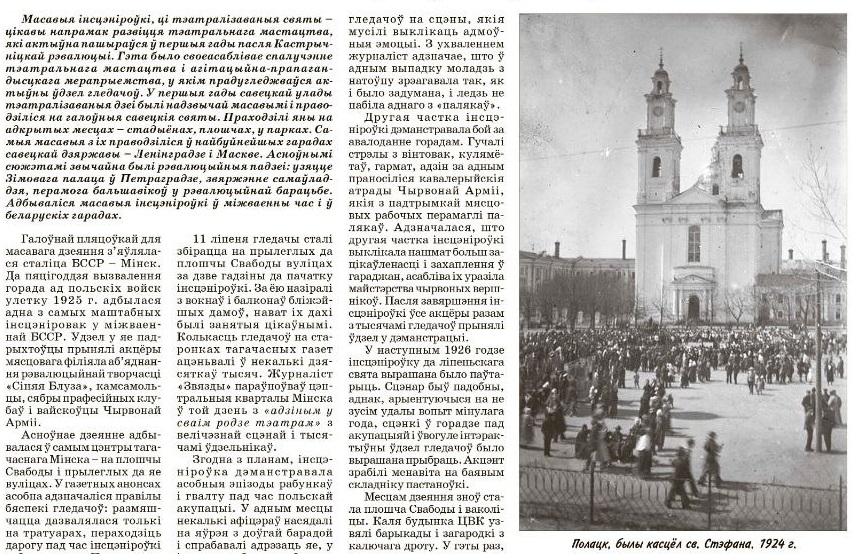 Масавыя тэатралізаваныя святы савецкіх часоў яшчэ памятаюць многія людзі старэйшага ўзросту. Якімі былі інсцэніроўкі ў першай палове XX ст.? З якой нагоды і з якой мэтай арганізоўваліся? Запрашаем на "экскурсію ў гістрыю" разам з Іллёй Вярбілам.