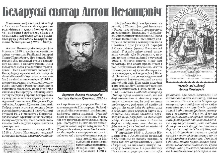 Беларускі рэлігійны і грамадскі дзеяч, выдавец і педагог, адзін з пачынальнікаў беларускага ўніяцкага руху Антон Неманцэвіч нарадзіўся ў Санкт-Пецярбургу і атрымаўшы там жа добрую адукацыю, абраў шлях святара. Пра яго дзейнасць, пра абарону веры, няпросты лёс