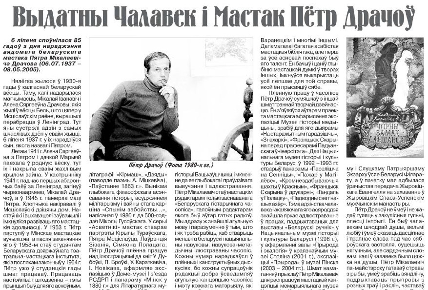 Пётр Драчоў, выхаванец Мсціслаўскага дзіцячага дома, бацькоў якога забрала вайна, мабыць, нават уявіць сабе не мог, што некалі стане знакамітым беларускім мастаком. Але жыццё склалася менавіта такім чынам. Пра характар, лёс і творчасць мастака распавяддае Максім Гальпяровіч.