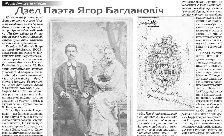 Фотаздымкі з калекцыі Літаратурнага музея М. Багдановіча могуць шмат распавесці пра яго продкаў і яго самога. Пра фота дзеда паэта, які быў неардынарным чалавекам, а таксама пра партрэт сям'і Мякотаў распавядае Максім Гальпяровіч.